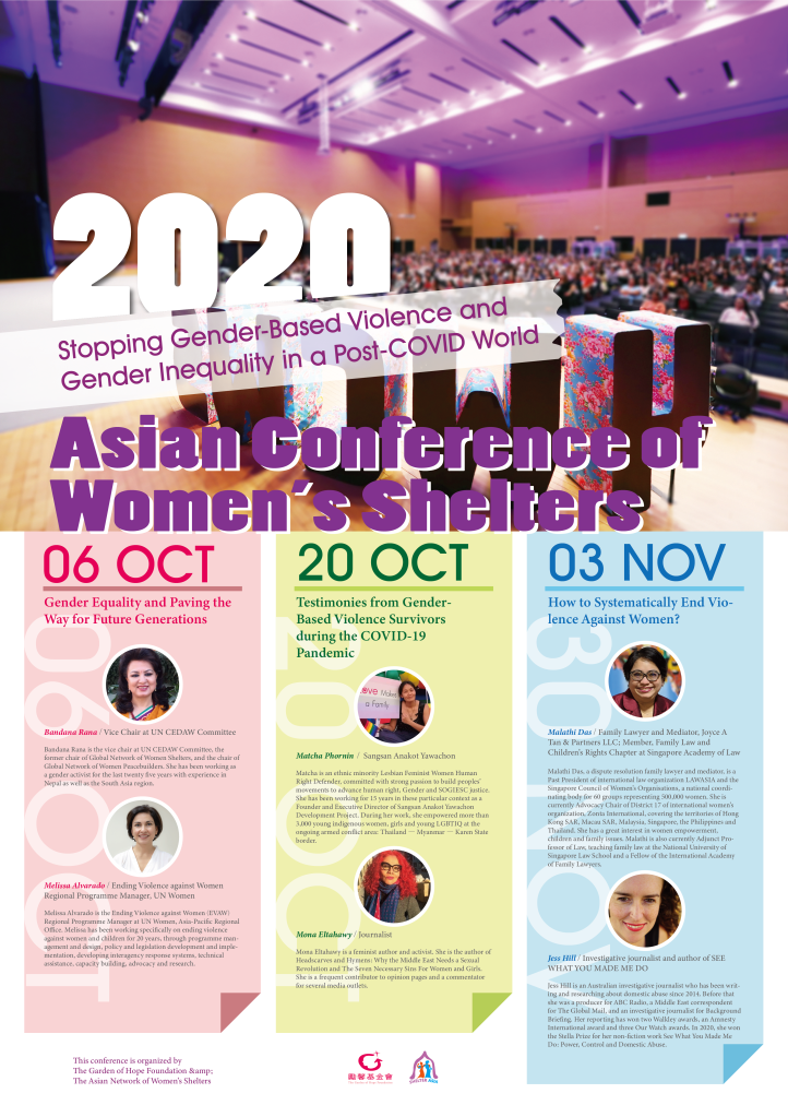 Registration for the 2020 Asian Conference of Women’s Shelters is now open! This year’s conference will take place virtually in three 90-minute webinars throughout October and November. We have a fantastic line-up of top speakers including CEDAW committee member and former GNWS chairperson Bandana Rana, UN Women AP Regional Ending VAW Programme Manager Melissa Alvarado, Thai LGBTQ activist Matcha Phornin, internationally renown journalist/author and activist Mona Eltahawy, Australian journalist and author of the groundbreaking “See What You Made Me Do” Jess Hill, and leading Singaporean lawyer Malathi Das. With the COVID-19 crisis still raging, the webinars will focus on empowering the next generation of activists and frontline shelter workers in the post-COVID age, hearing and responding to the voices of survivors, and concrete steps to end the shadow pandemic of violence against women and girls.
