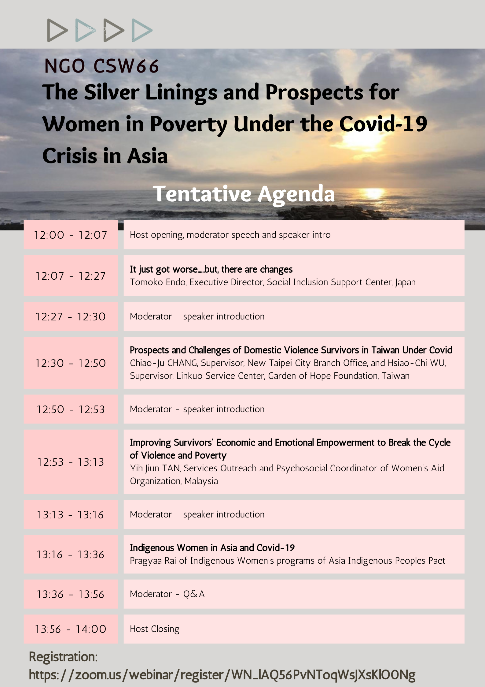 ANWS together with the Garden of Hope Foundation in Taiwan will hold a NGO CSW66 parallel event: The Silver Linings and Prospects for Women in Poverty Under the Covid-19 Crisis in Asia on 17 March at 12:00 a.m. ET (please click here for your local time).